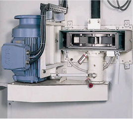 拋丸器中的雙圓盤鉚接成一體,構成葉輪體。葉輪體上裝有八片葉片,葉輪體與位于拋丸輪中心的分丸輪一起裝在由電動機驅動的主軸上。罩內襯有護板,罩殼上裝有定向套及進丸管。工作時,彈丸由進丸管流入拋丸器。跟葉片作同步旋轉的分丸輪使彈丸得到初速度。彈丸經定向套的窗口飛出,拋到定向套外面的高速旋轉的葉片上,被葉片進一步加速后,拋射到被清理工件的表面上。因為分丸輪和葉片作同步旋轉保證了彈丸向葉片的無振動傳遞,從而減小了對葉片的磨損。